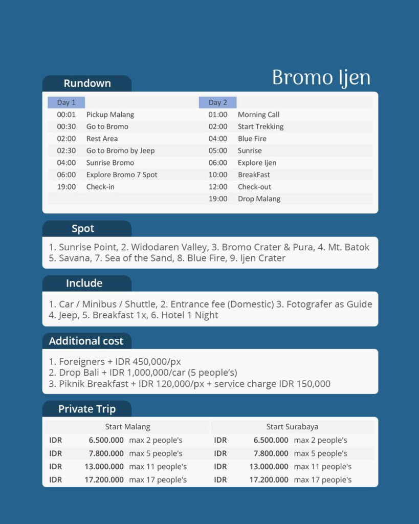 Di hari terakhir, kalian akan menuju Kawah Ijen untuk menyaksikan fenomena langka Blue Fire yang hanya bisa ditemui di sedikit tempat di dunia. Perjalanan dini hari yang menantang akan terbayar saat melihat api biru menyala di tengah gelapnya malam, dilanjutkan dengan pemandangan kawah berwarna toska yang begitu memukau. Sebuah akhir perjalanan yang penuh kesan dan pengalaman luar biasa.